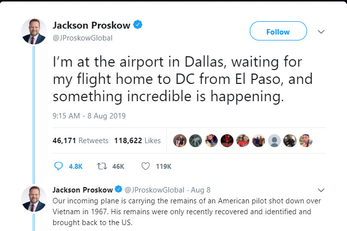 Proskow wrote that the airport was so silent for several minutes while people watched, transfixed, as the war hero was transported one step closer to finally getting the send-off he deserved: “What a privilege it was to witness this moment.”