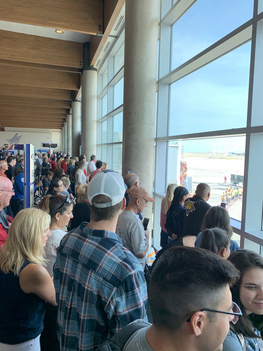 People gathered by the floor-to-ceiling windows to watch a massive blue, red and yellow Southwest plane pulled in and a gate agent narrated the scene before them.