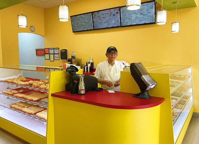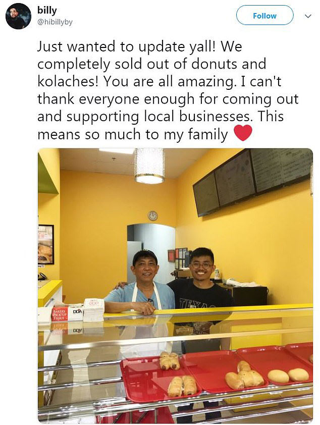 ‘Just wanted to update yall! We completely sold out of donuts and kolaches! You are all amazing. I can’t thank everyone enough for coming out and supporting local businesses. This means so much to my family,’ he wrote, adding a new photo of him smiling next to his also-beaming dad.