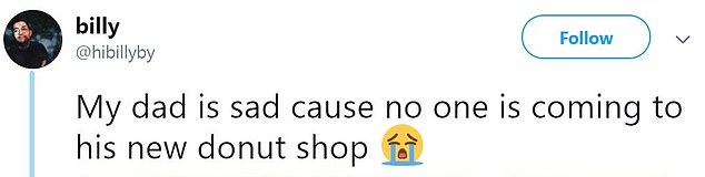 ‘My dad is sad cause no one is coming to his new donut shop,’ Billy tweeted on Saturday afternoon.