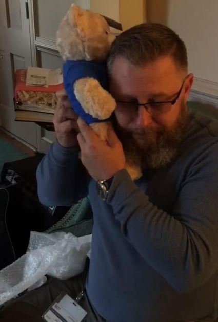 Stephanie Reid has shared a video in which her husband is seen opening the box containing the teddy bear as he is full of sorrow for the death of his son.