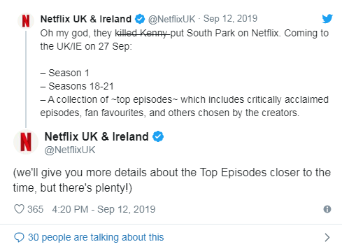 While Disney is bringing back The Simpsons, Netflix has announced that they are bringing back South Park in UK and Ireland, and it will be up in the streaming service next month.