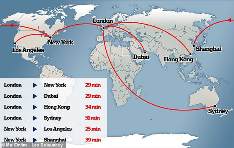 It would take just 29 minutes for a trip from London to New York and less than 60 minutes from London to Sydney.