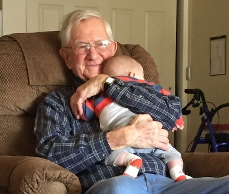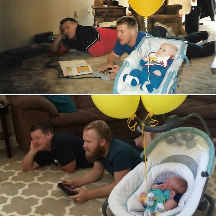 - A memorable throwback picture where the grandfather is holding the grandkid in the first photo and in the second holding his great-grandkid