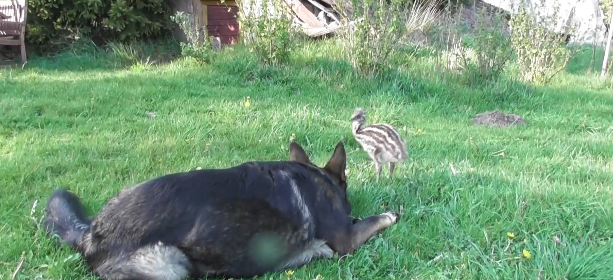 Watch this heart-melting video of a black German shepherd bonding with an Emu chic in the backyard.