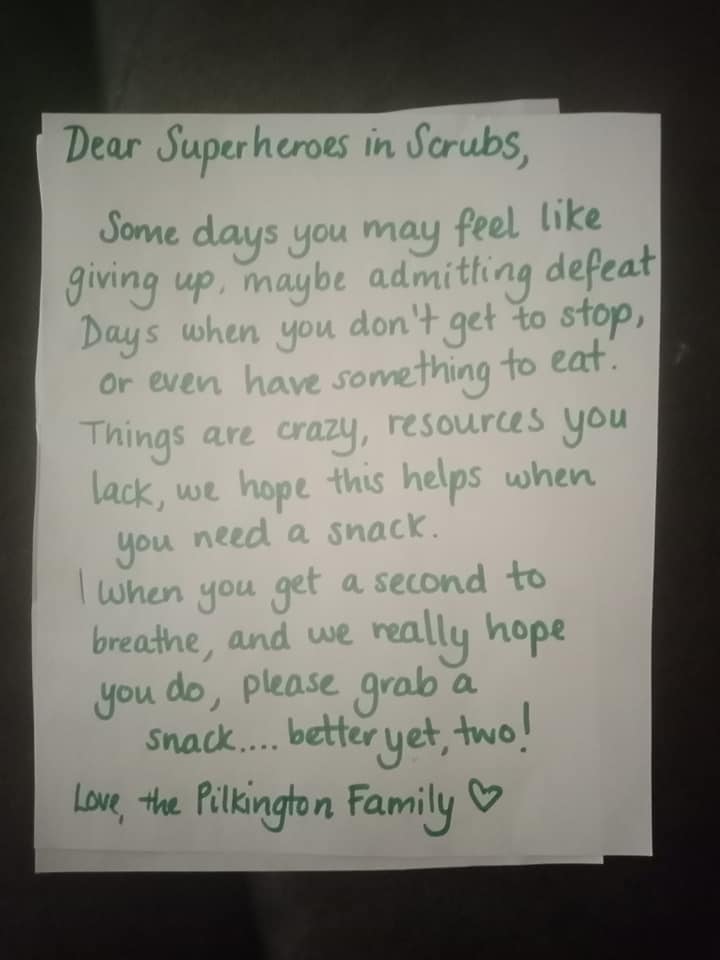 “Things are crazy, resources you lack, we hope this helps when you need a snack. When you get a second to breath, and we really hope you do, please grab a snack… better yet, two. Love the Pilkington Family.”