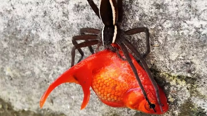 “I’ve never seen something like that before. I knew [the spiders] could fish, but never such a large size. You see it sometimes with small fish like fingerlings, but never with a goldfish. This was twice the weight of the spider.”