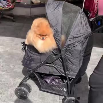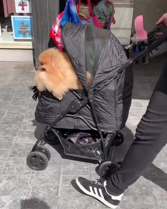 The video shows how a Pomeranian puppy went crazy for a ride in a baby car while his partner had to walk the same distance with his leash.