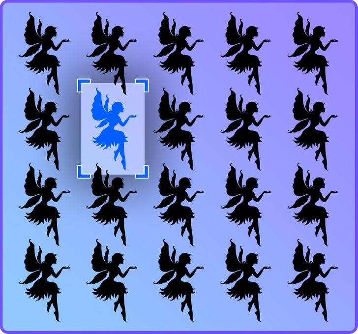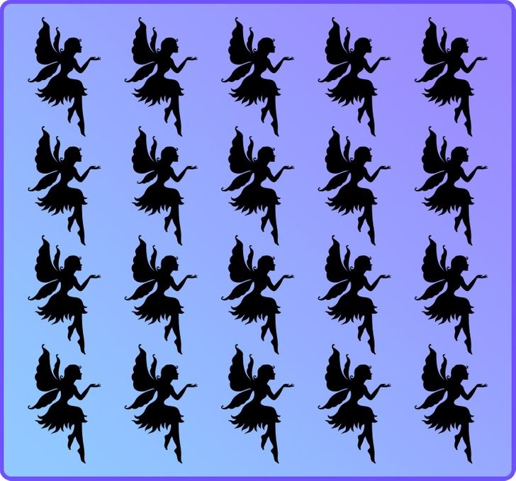 This time, you’re looking at a bunch of fairies on a purple background. While 19 of them are identical, one is slightly different from the lot.