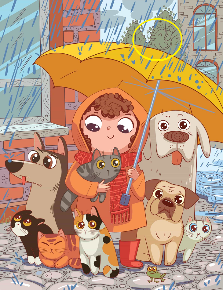 The picture shows a child wearing an orange raincoat while holding a big yellow umbrella. She is surrounded by stray dogs and cats. There is also a frog in front of the picture, have you noticed it?