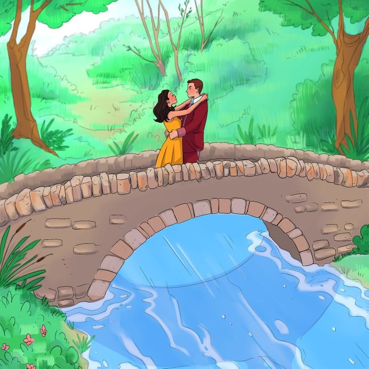 This time, you can see a couple with their arms wrapped around each other standing on top of a stone bridge in the middle of a forest.
