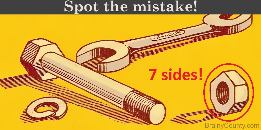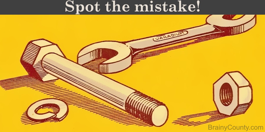 This time, you have to spot a mistake in the picture showing a series of tools including a hex nut, a hex bolt, and a wrench.