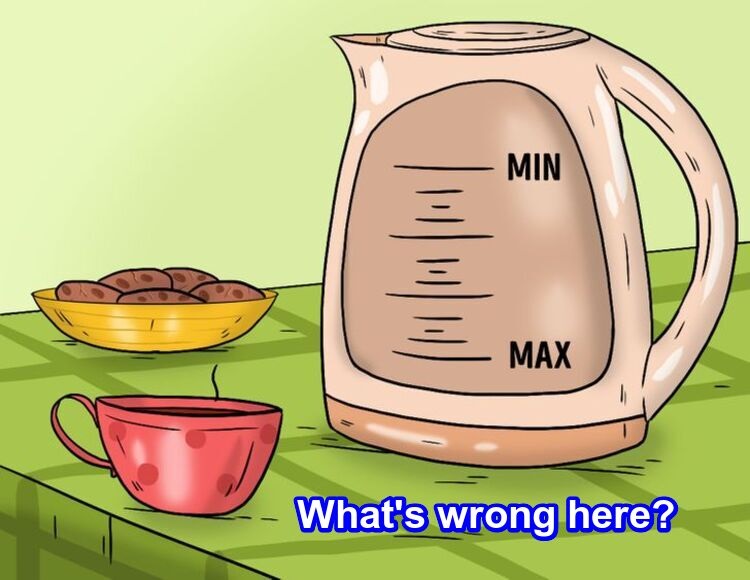 In the image above, you can see a water kettle, a bowl filled with delicious cookies, and a warm cup of coffee. Once again, however, there is also a clever error somewhere in there.