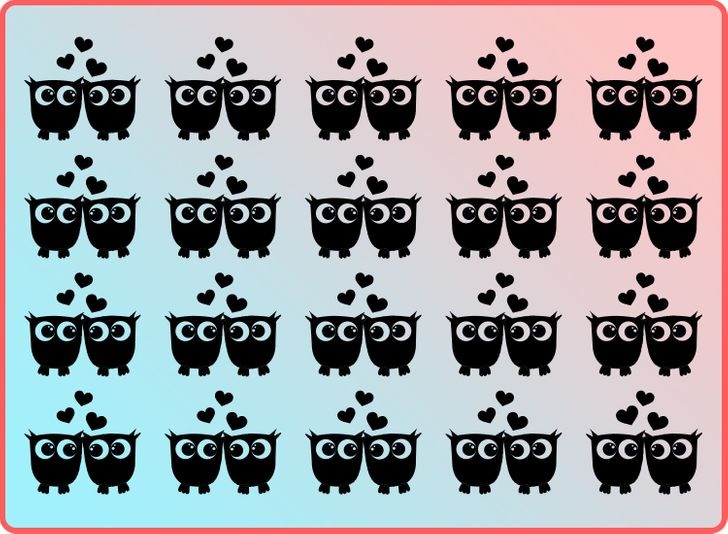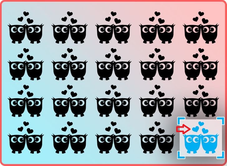 In the picture above, you can see twenty pairs of adorable owls with hearts flying over their heads. Though they appear the same at first glance, one of the pairs is different from the lot.