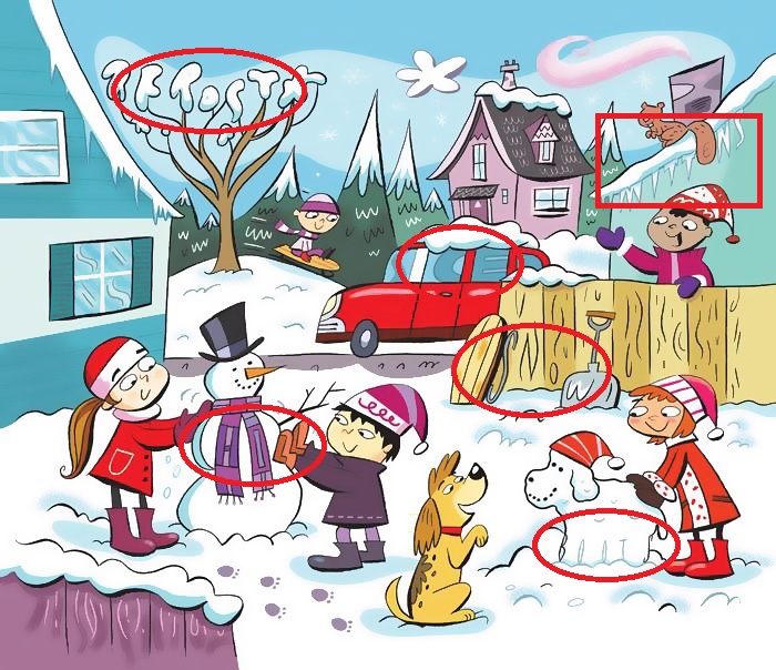 In this picture, you can see a bunch of kids playing outside in the snow. Again, there are also six words that are cleverly hidden somewhere in the picture. Find them all!