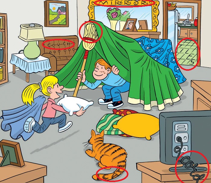 What did you spot while taking a look at the picture? Did you see two kids playing in their family home? How about the couch, the mirror, and the cat lying on the floor?