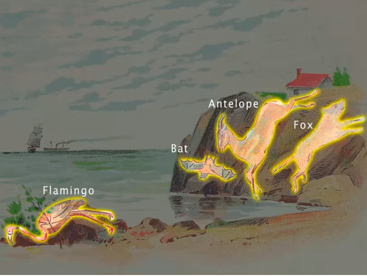 If you are struggling to find the animals, here’s a clue for you: the hidden animals are bat, fox, flamingo, and an antelope.