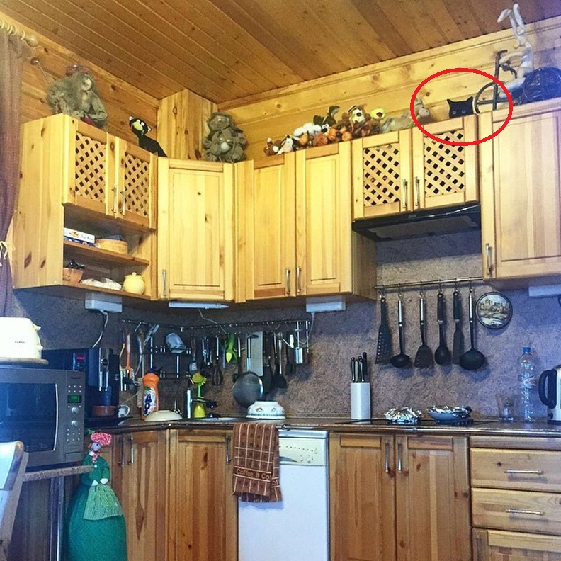 Here’s a hint to help you out a bit. The cat is pretty dark and is hiding high above the floor. While you can’t see its entire body, you can definitely see its head and pointy ears.
