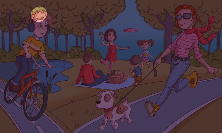 The image shows people doing different activities at a park. There is a family having a fun-filled picnic next to a lake, a woman walking her dog out, and a boy riding a bicycle while listening to music.