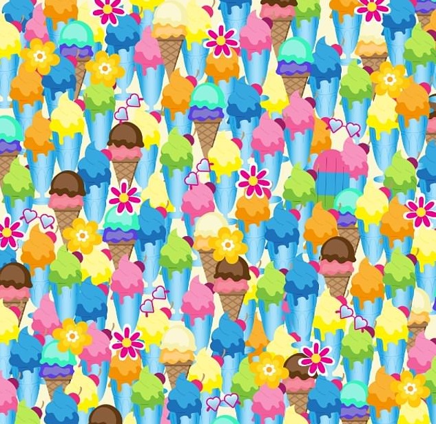 In this picture created by TOMY, you can see a series of colorful ice creams. You might also notice several flowers and sunglasses hiding among the desserts.