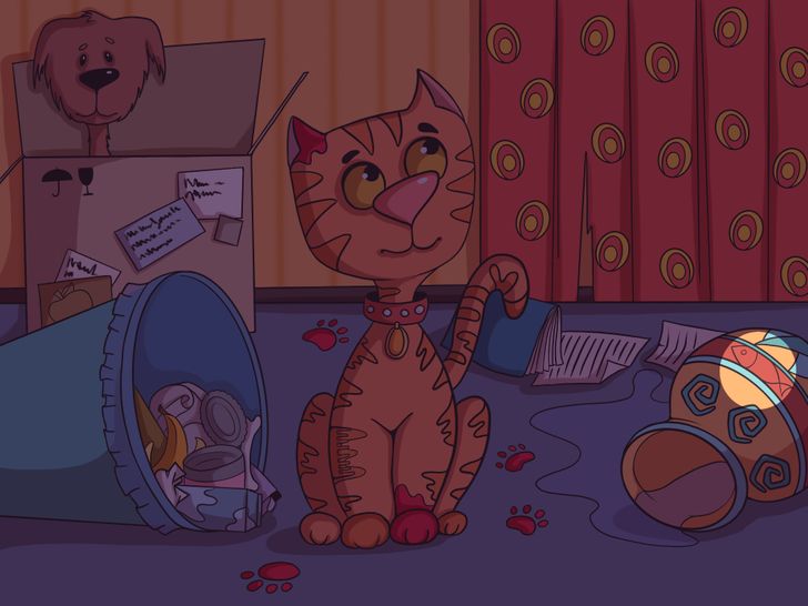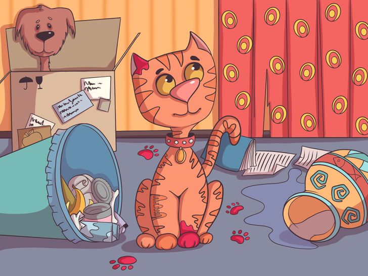 The image shows a cat leaving a mess around the house. There is also a pooch in the background. But have you spotted the hidden fish yet?