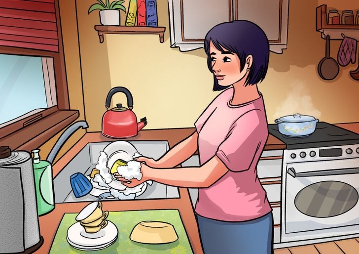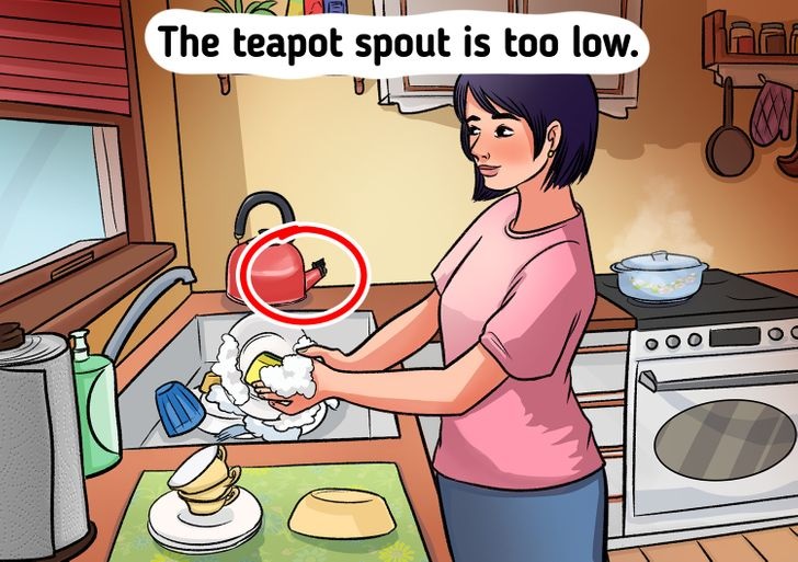 If you pay attention to the stove in the background, you may also notice that the lady is cooking a delicious meal while taking care of the dishes. But where’s the mistake?