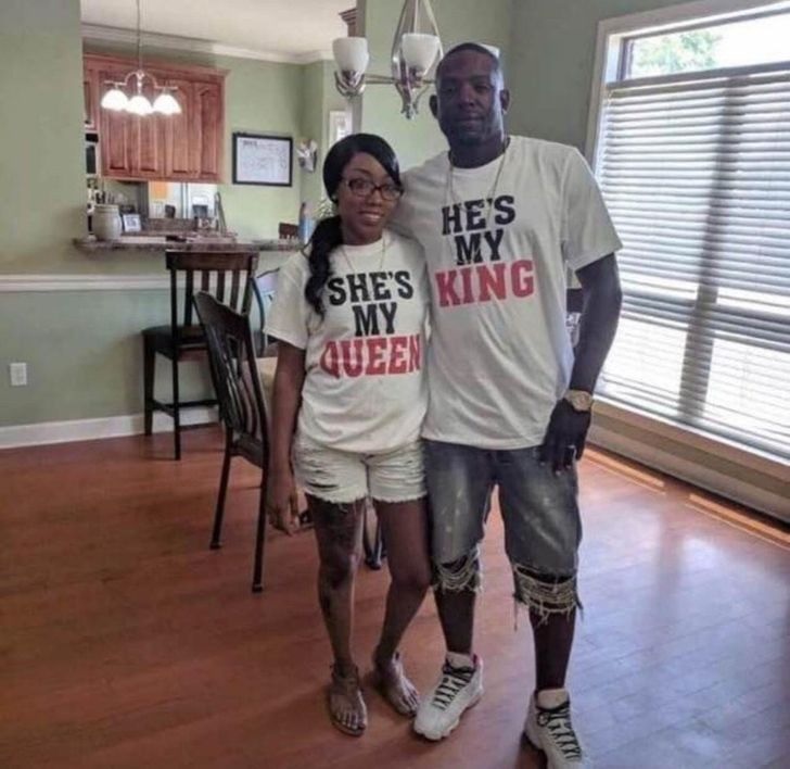 It looks like the lovebirds got their shirts all mixed up! The man is wearing the shirt that reads ‘he’s my king’ while the lady’s shirt says ‘she’s my queen.’