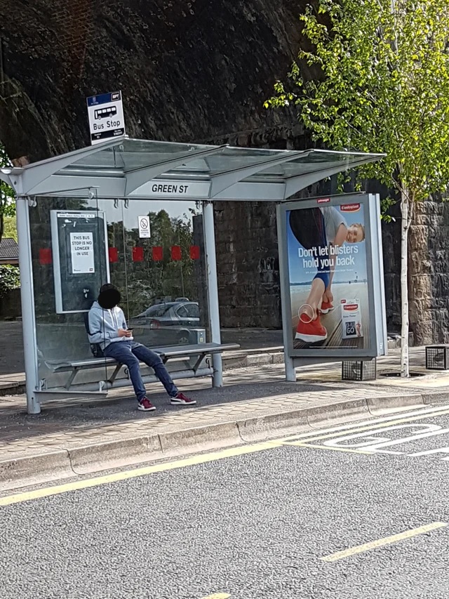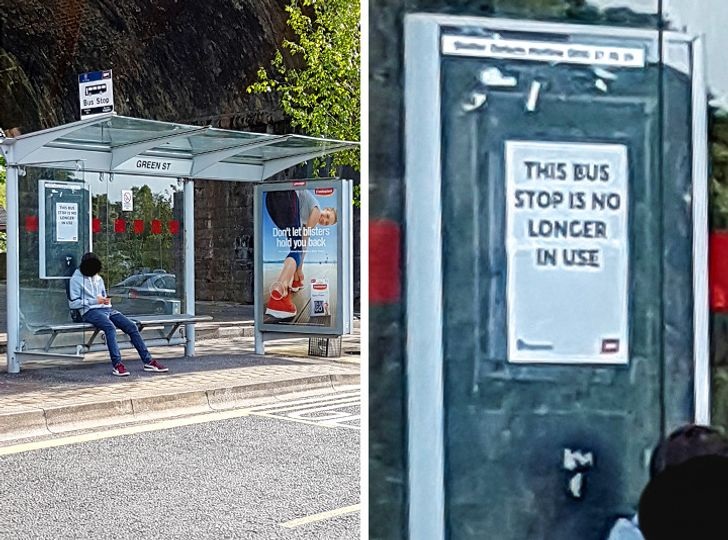 “This bus stop is no longer in use,” the sign reads. He better not be waiting for a bus or he’s going to be sitting there for quite a while!