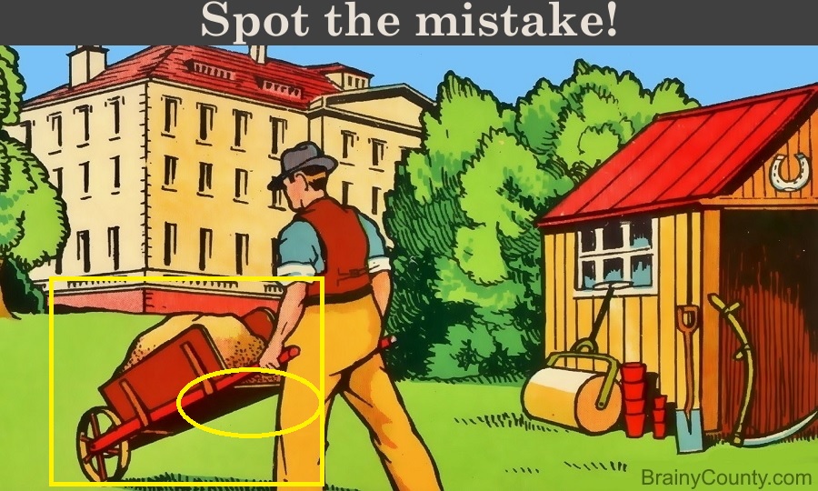 Here’s another clue. Try finding some real pictures of wheelbarrows and study them carefully. Once you’re done, return to the image above and see if you can spot something unusual about our little vehicle.