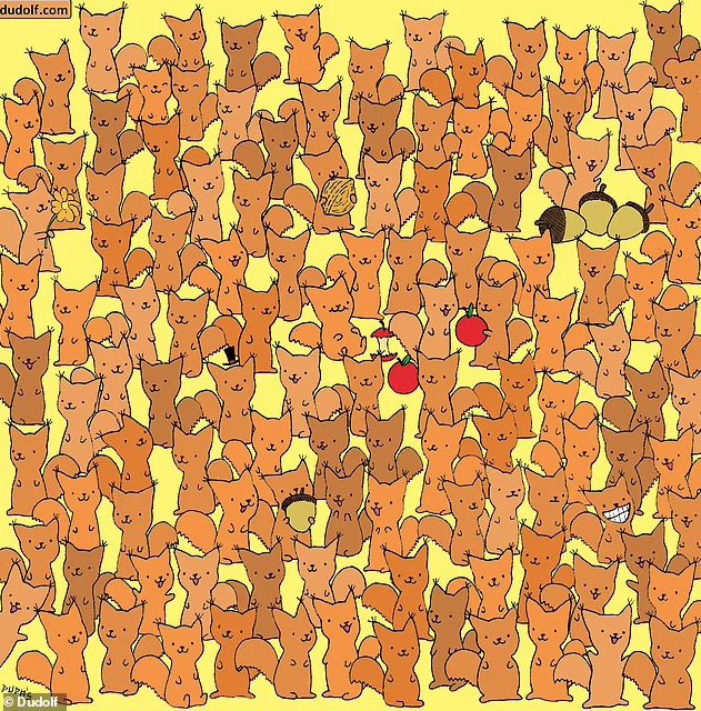 In Dudolf’s graphic below, puzzlers are asked to find the one and only mouse hiding in a busy scene full of squirrels.