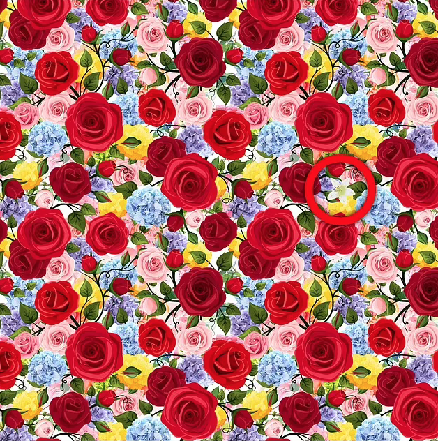 The challenge asks puzzlers to find the white lily hiding among the bed of roses and blue hydrangeas.