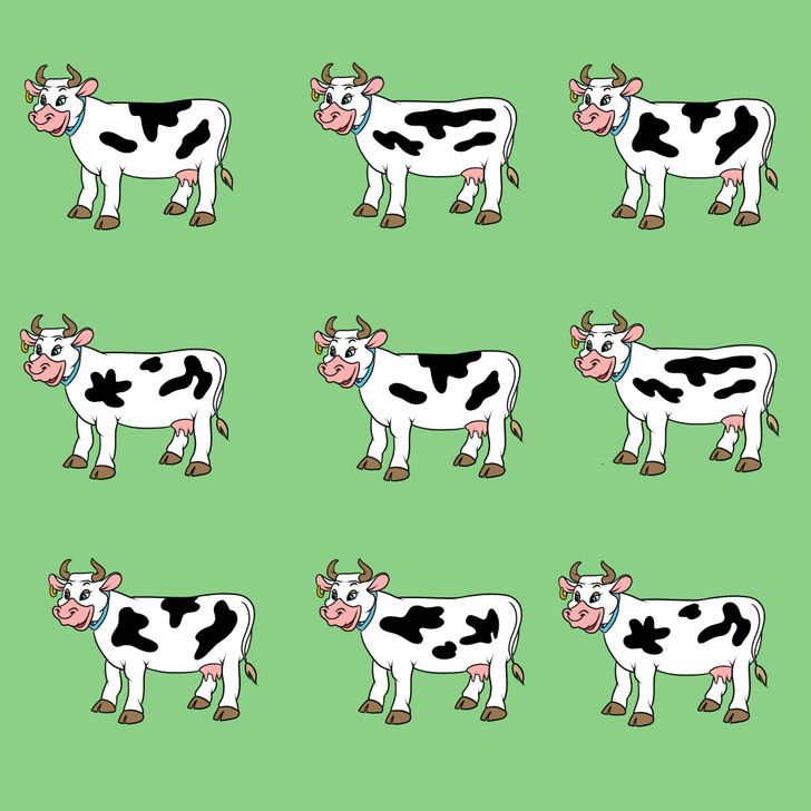The picture shows nine cows and one of them doesn’t have a partner. Can you figure out which of them is the odd one?