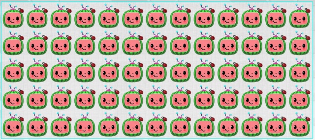 As it happens, the watermelons are accompanied by ladybugs this time. One of them, however, doesn’t have a bug on its head. It also lacks the Hollywood smile that the other watermelons have and has antennas facing the other way.