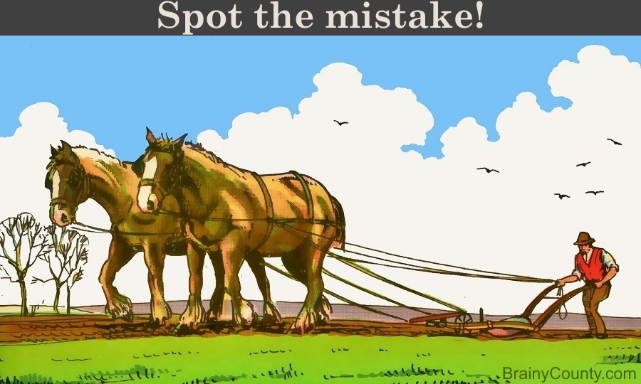 In the picture below, you will see a hardworking farmer tilling the soil with the help of his horses. Somewhere in the countryside scene, there is also a major error. Spot it in under one minute to pass the test!