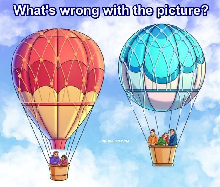You probably noticed the two hot air balloons floating in the sky. There are two people in one of them and three in the other. But where’s the mistake?