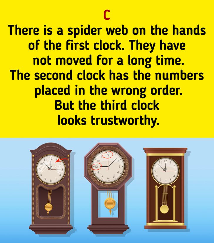 The image shows three clocks hanging on the wall but only one of them is trustworthy! Is it A, B, or C? Have you figured it out yet?