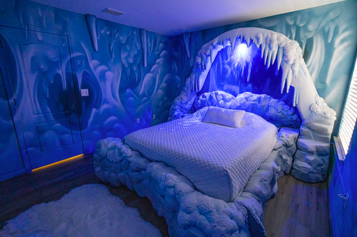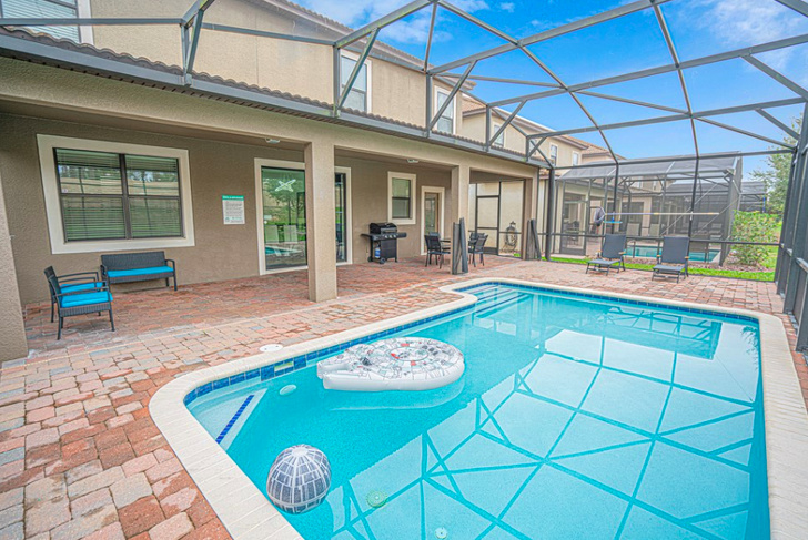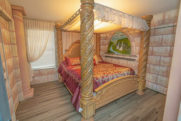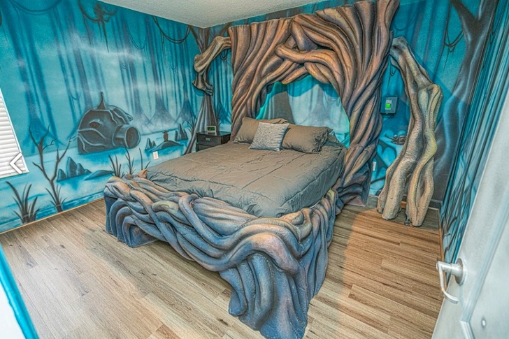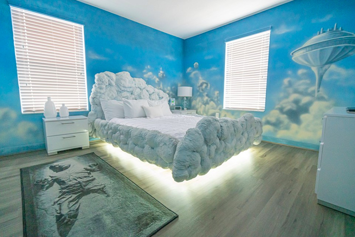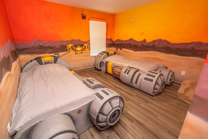 The outstanding rental is located in Davenport, Florida, just 15 minutes from Walt Disney World. Each of its nine bedrooms reminds you of a location from the film franchise.