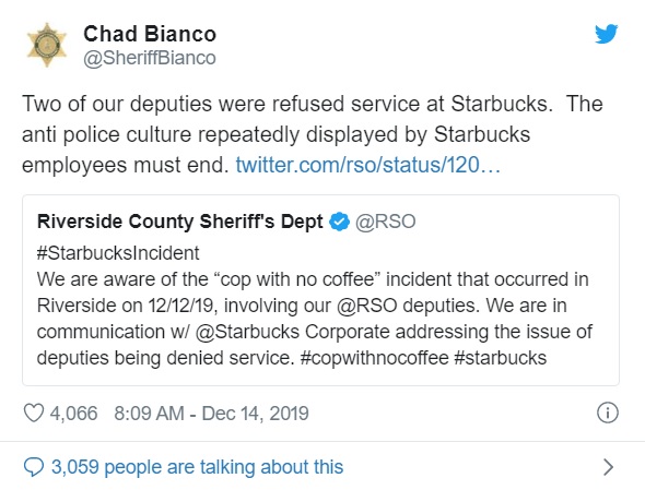 “#StarbucksIncident We are aware of the ‘cop with no coffee’ incident that occurred in Riverside on 12/12/19, involving our @RSO deputies.