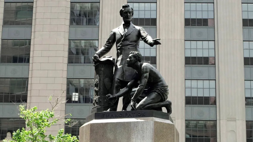 The bronze statue in question depicts Abraham Lincoln, the 16th president of the U.S., and a freed slave who is kneeling by his side. The statue is a copy of the 1876 memorial created by Thomas Ball and displayed, up to this day, at Washington’s Lincoln Park.