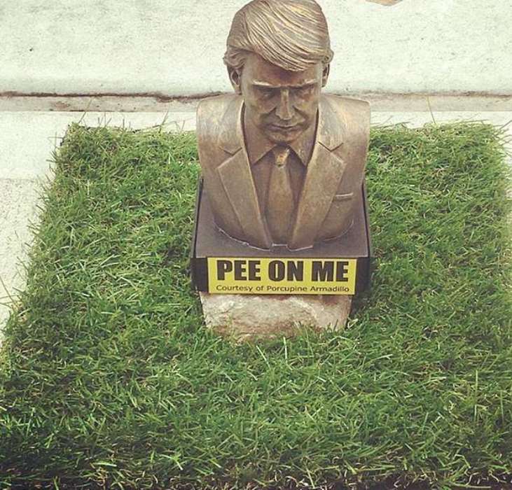 A series of tiny statues of President Trump with a sign encouraging dogs to ‘pee on me’ have appeared across Brooklyn.