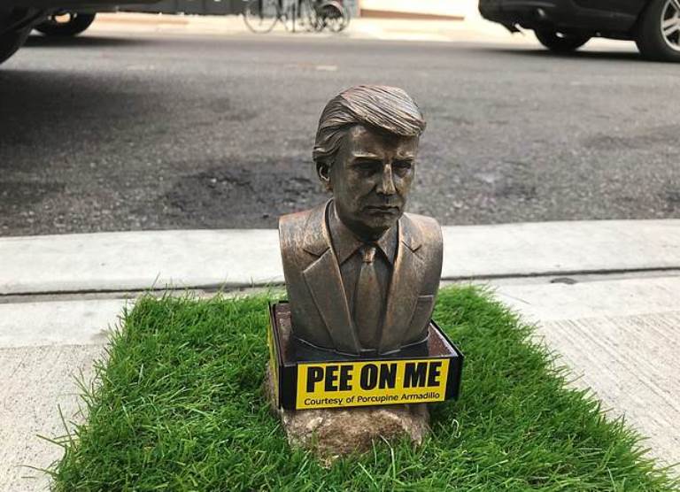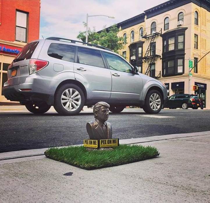 Phil Gable, an advertising professional, placed the small statues around Park Slope. He told Gothamist: “It was largely just a personal expression of my own disdain for Donald Trump, both as a President and a human being.”