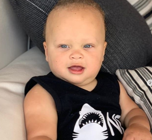 The photograph showed the beauty in a pair of white clothes while sitting along with her little boy who was sporting a shark ensemble.