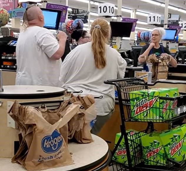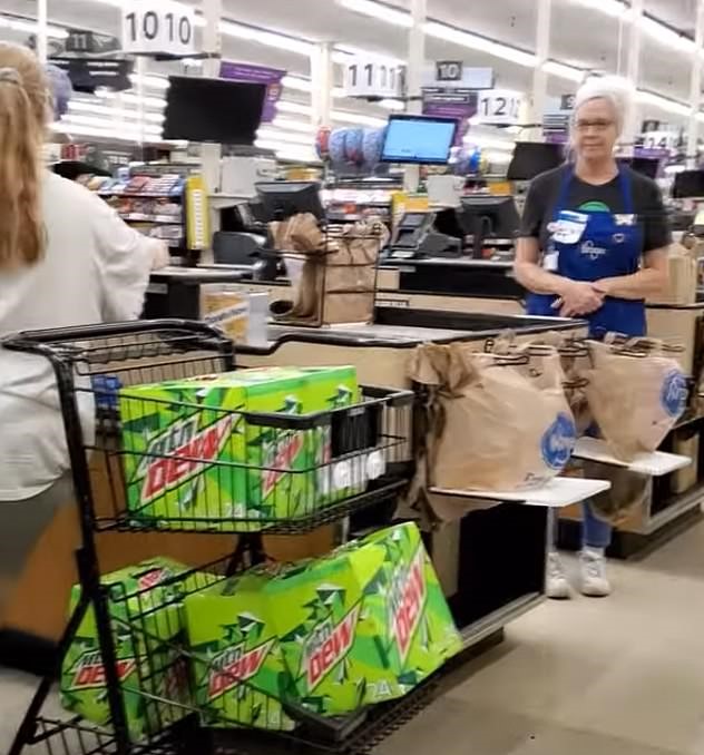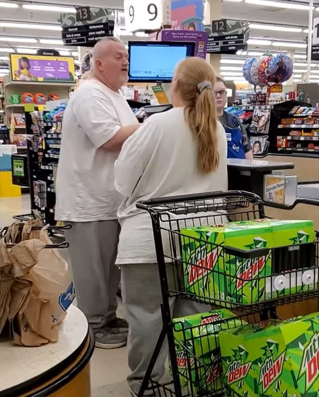 After the cashier informed him they were only allowed to take out two more boxes of Mountain Dew, the man pushed the cart forward whereas his partner threw two of the boxes back onto the counter.