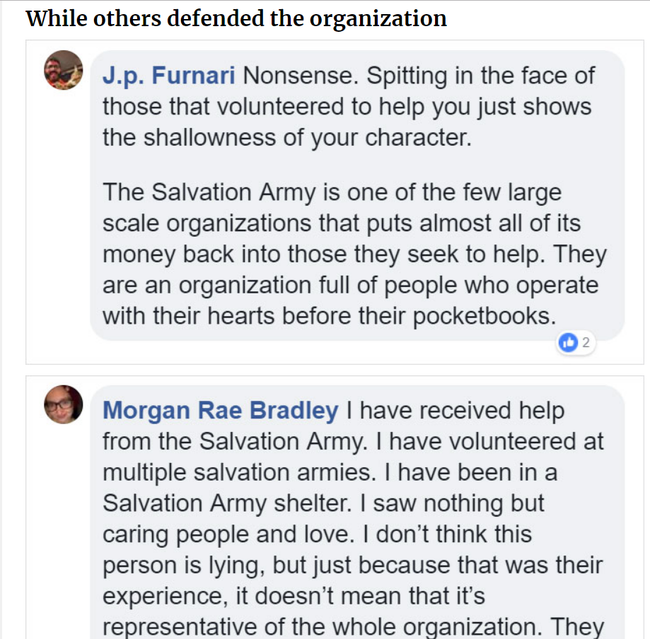 On the other hand, some people stood up in favor of the Salvation Army. Their point was that one rotten apple doesn’t mean that the whole tree is bad. They say that even if one of the facilities is not providing good conditions, people should not blame the Salvation Army as they are doing great work.
