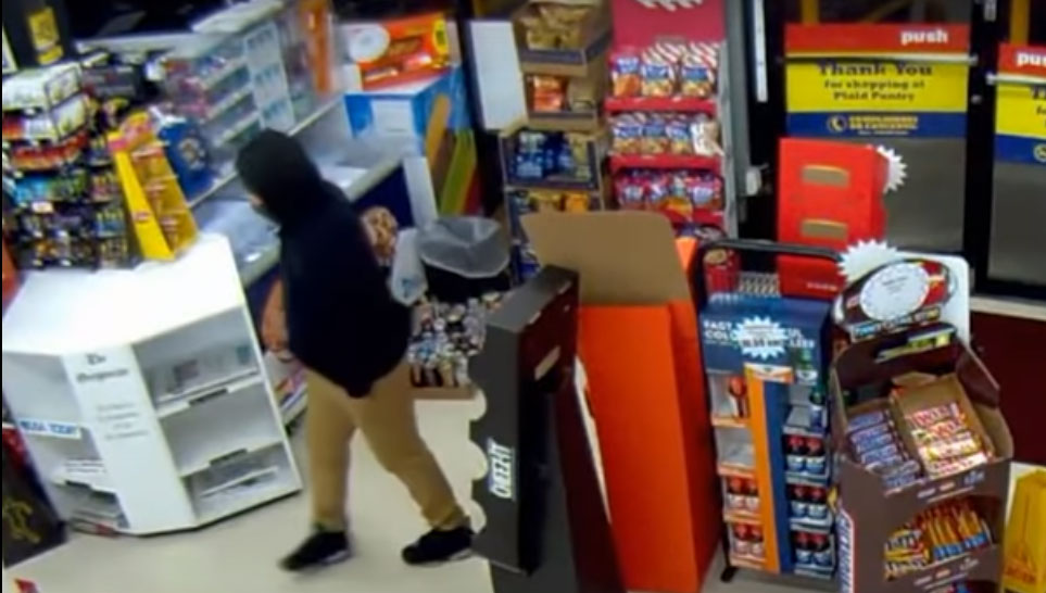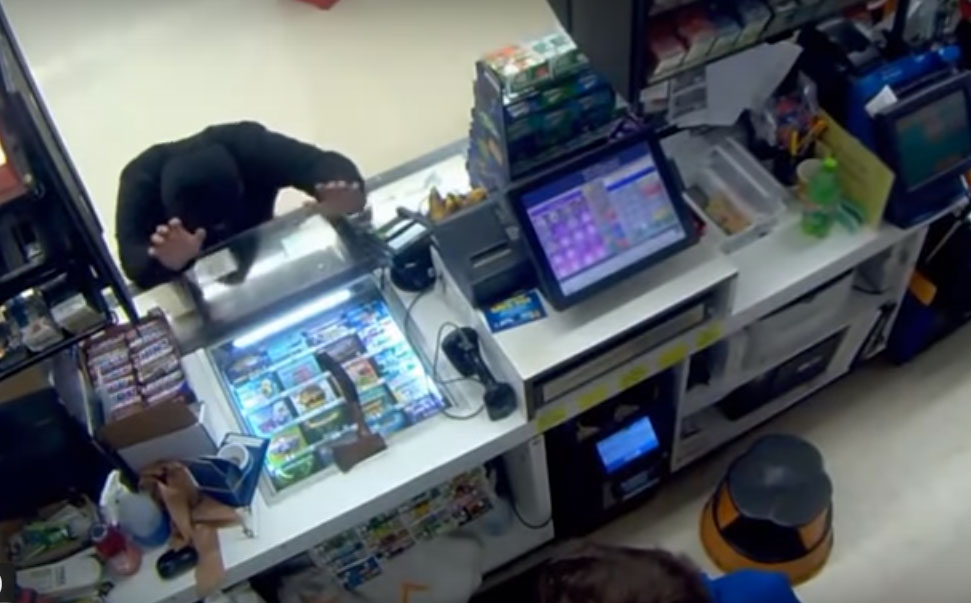 The thief wore dark clothing and a mask on his face and put the 12-inch hatchet on the counter to threaten the clerk. Instead of afraid, the clerk pulled out a gun to protect himself and the store and captured in surveillance footage calmly calling 911.