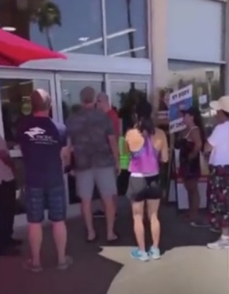 A group of customers rallied outside a store in California and accused the managers of “keeping customers hostage” and “committing war crimes.