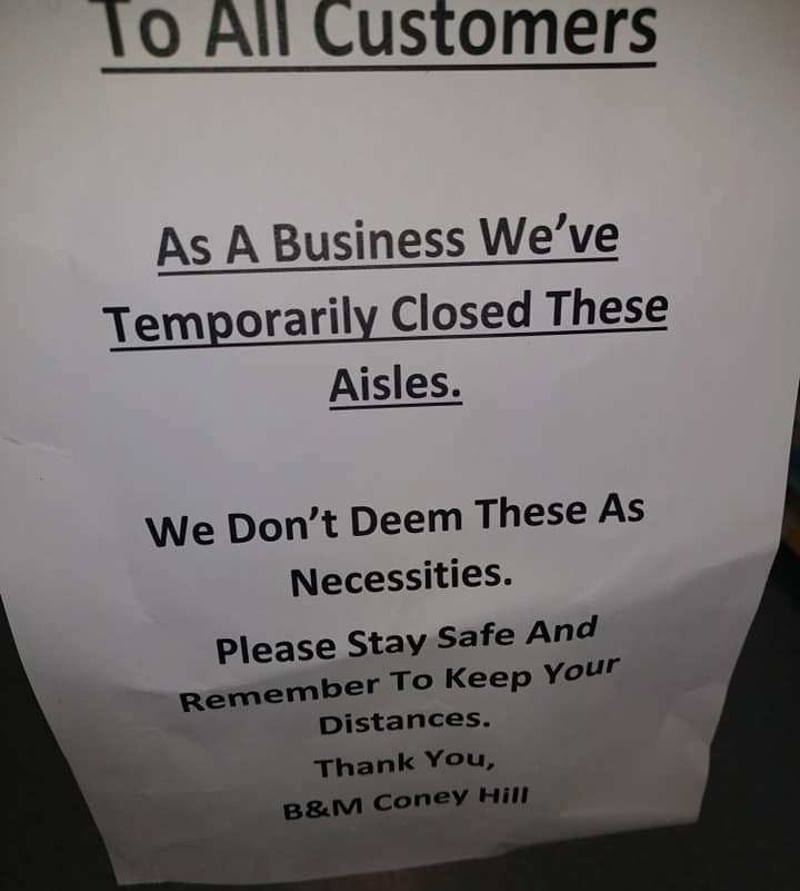 The sign read: “To all customers, as a business we’ve temporarily closed these aisles. We don’t deem them as necessities. Please stay safe and remember to keep your distances.”