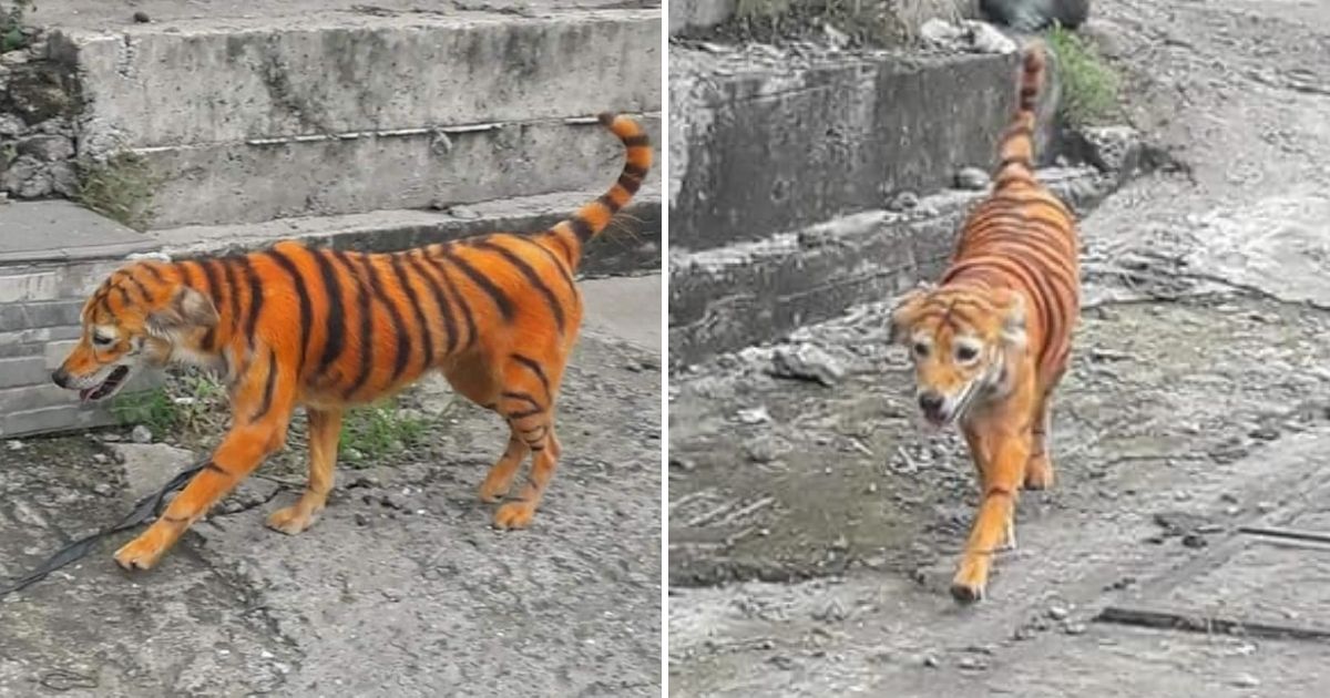 As seen in the photos, the stray dog was painted orange with black stripes that resemble a tiger’s fur scattered across its body.