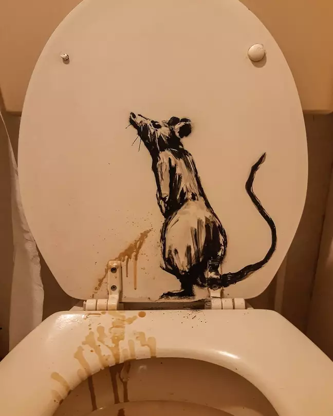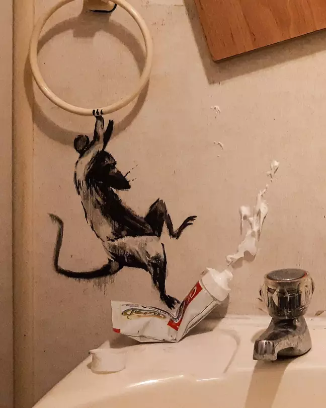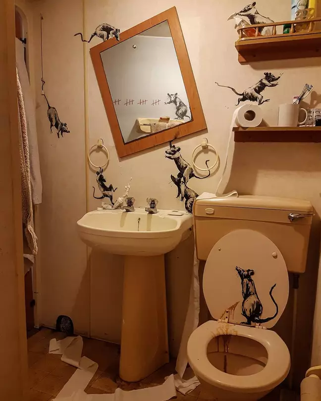 The street artist drew his famous rats that appeared to have gone rogue in the washroom, disrupting everything from the toothpaste to the toilet paper.