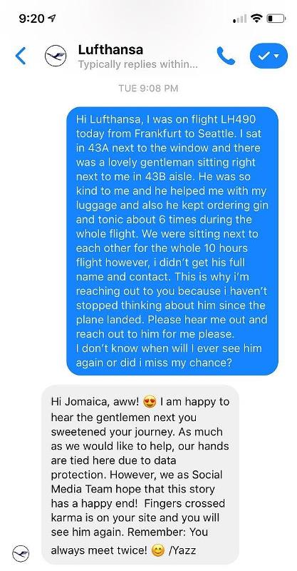 Desperate to find the ‘lovely gentleman,’ she messaged airline Lufthansa to see if they could help her. Even though Lufthansa loved hearing about her sweet and enjoyable flight, there was nothing they could do to track him down due to data protection problems.